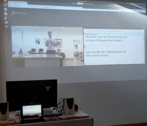 Im Computerraum ist das Lehrergerät schon mit dem Beamer verbunden und es genügt, wenn sich eine Person am Lehrergerät anmeldet und eine Verbindung zu Jitsi per Web-Browser aufbaut.