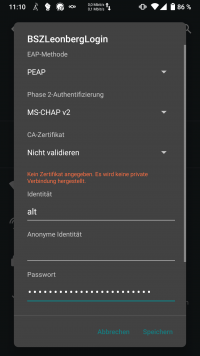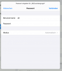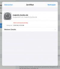 Hier sind nur Benutzername und Passwort zu hinterlegen. Bei iOS gibt es eine Zertifikatswarnung. In diesem Fall kann man dem Zertifkat von majestix.bszleo.de vertrauen.